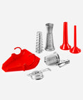 This set includes: Tomato Squeezer Set - Cheese/ Almond/ Chilli grater. Biscuit attachment & sausage funnels (10, 20mm)