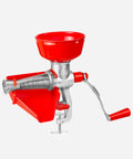 The machine uses a cast-metal body to withstand repeated turning and larger quantities of tomatoes. -